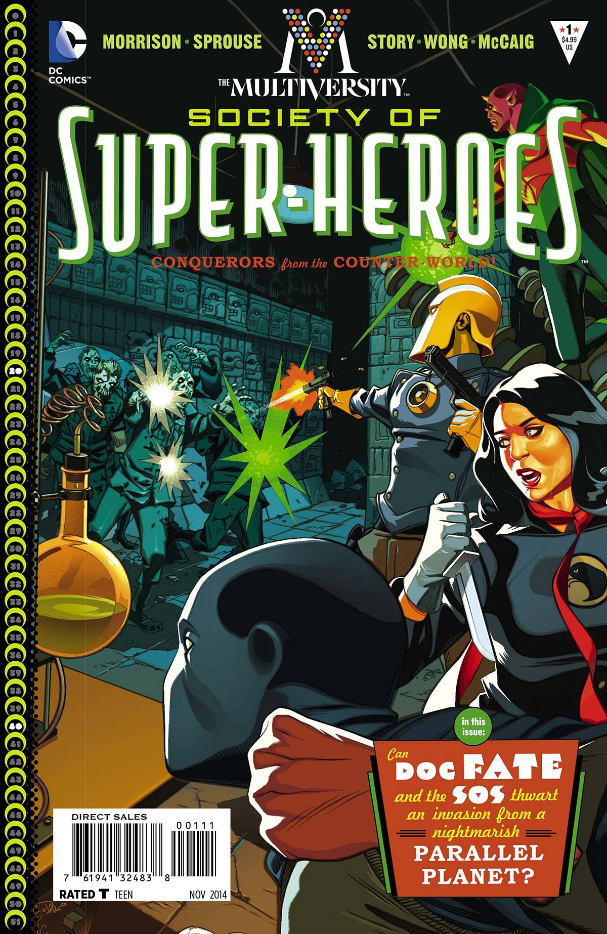 The biggest adventure in DC Comics history continues! Grant Morrison joins modern legend Chris Sprouse (TOM STRONG, BATMAN: RETURN OF BRUCE WAYNE, ACTION COMICS) for a trip to Earth-20 starring a Society of Super Heroes unlike anything you've seen before! It's pulp Super Hero action with a post-modern twist - you can't afford to miss it! Who is the demon-like Green Lantern protecting Earth-20? What secret does Doc Fate hold that could save the world? Who are the hand-to-hand and air-to-air combat queens known as the Blackhawks? And what happens when these heroes come face to face with their diabolical Earth-40 counterparts - led by Vandal Savage - for an epic war between parallel worlds? Find out all that and more in this exciting stand-alone issue which also acts as chapter two of the overall MULTIVERSITY storyline. Join us, if you dare, for THE MULTIVERSITY!
