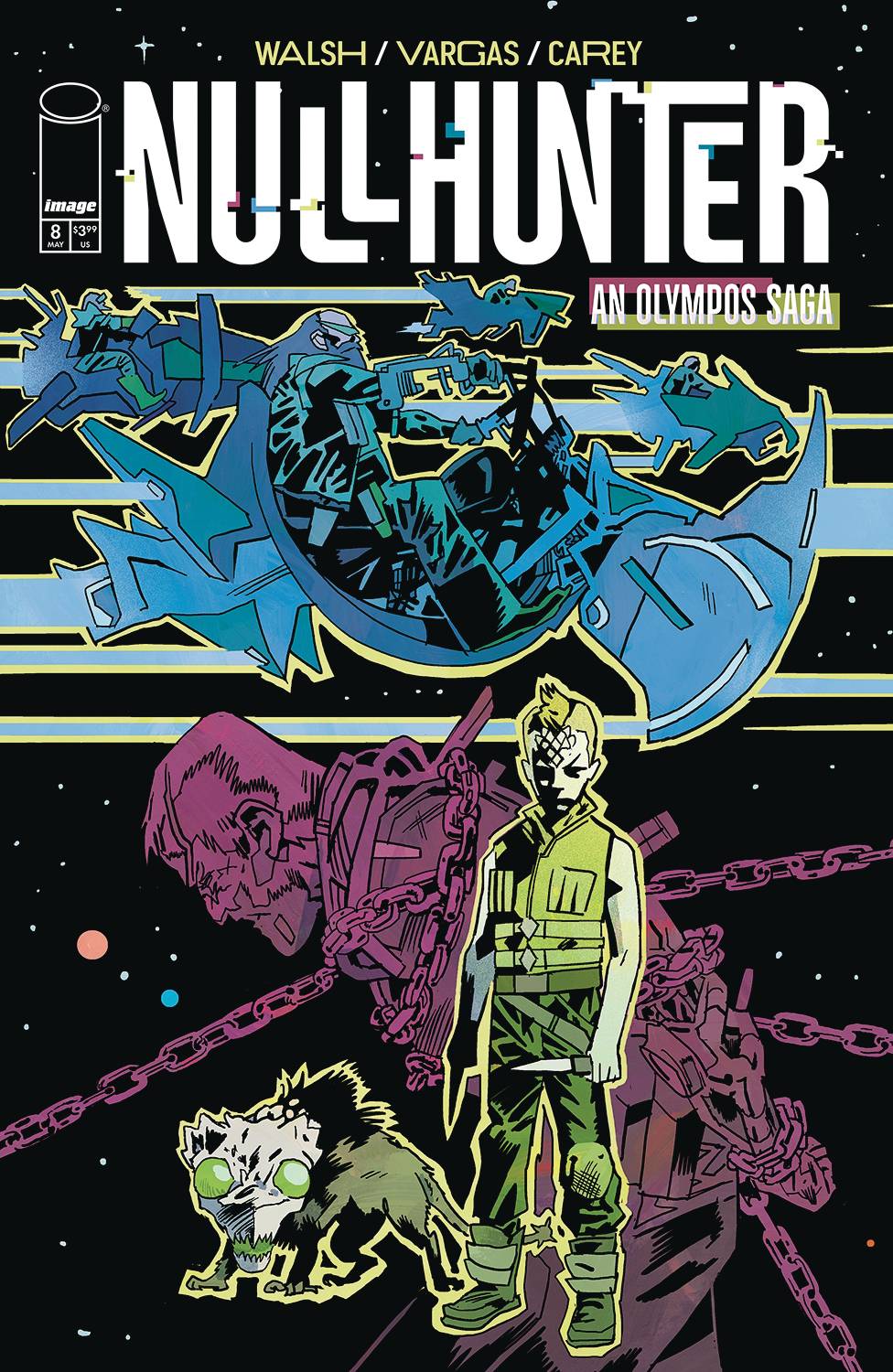 A mission goes awry, and Clay is captured by a barbaric gang of hover bikers. After narrowly escaping the Maneaters himself, Simon assembles a crew of street orphans for the blood-soaked rescue mission. From writer MICHAEL WALSH, guest writer AARON LOSTY, and artist GUSTAFFO VARGAS, the eighth chapter of NULLHUNTER, the cyberpunk retelling of Hercules, is out in May.