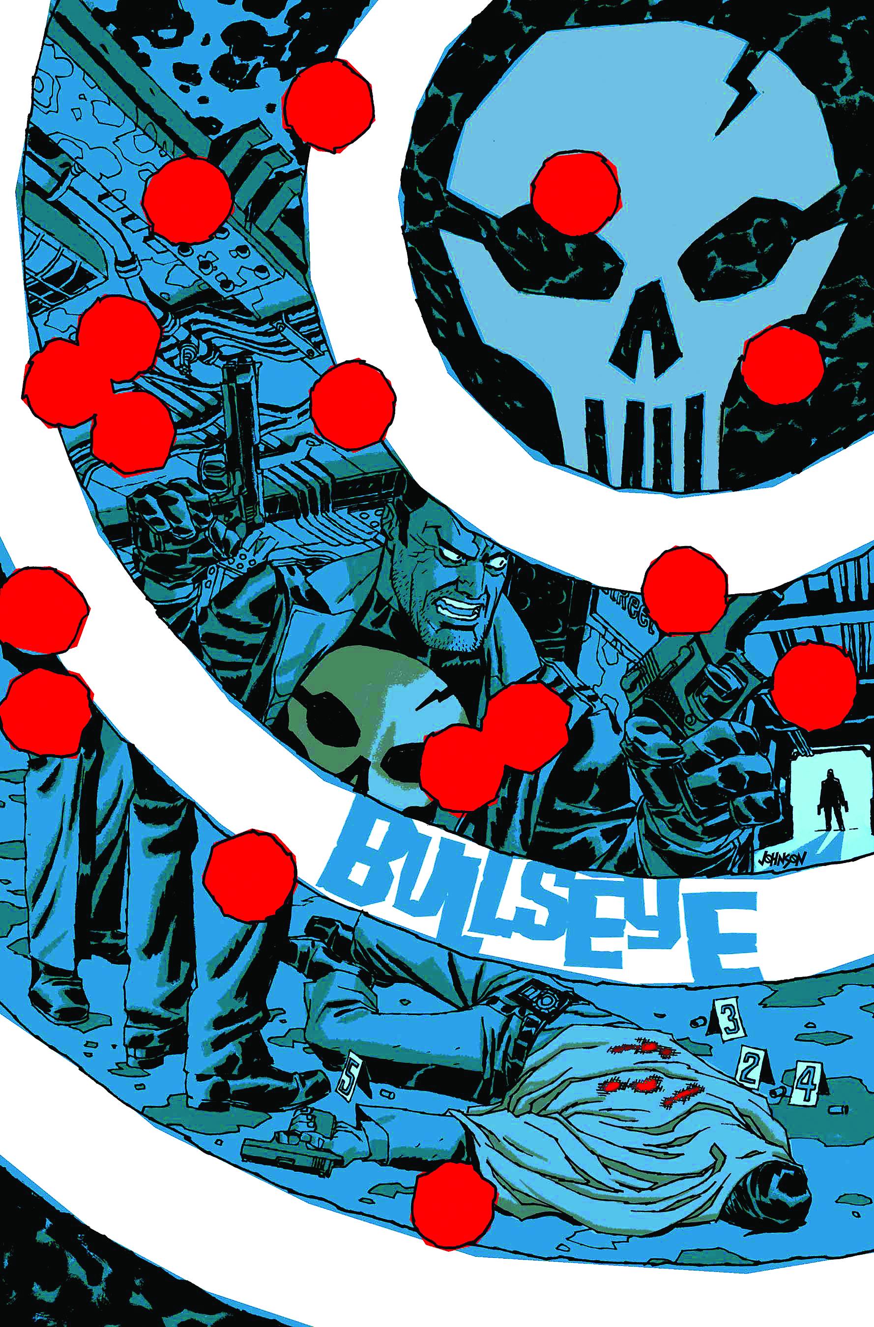 Written by JASON AARON Penciled by STEVE DILLON Cover by DAVE JOHNSON "BULLSEYE," PART 3 Frank makes a bold choice when he decides to go after a dirty cop on the Kingpin's payroll. Having the psychotic assassin Bullseye hot on his trail is one thing, but can the Punisher hold off the entire NYPD as well? 32 PGS./Explicit Content ...$3.99