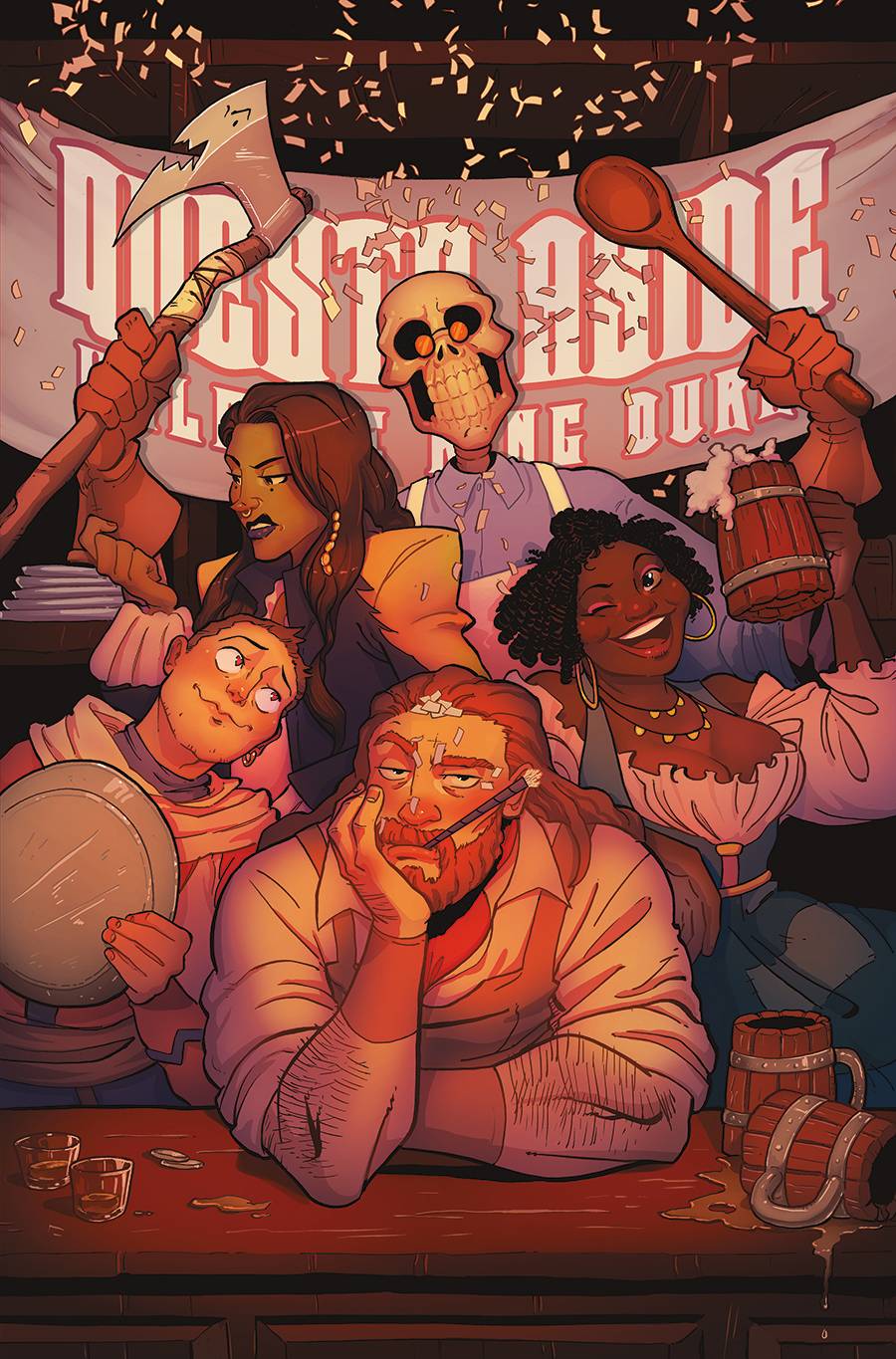 A skeleton, an apprentice mage, and an exiled princess walk into a bar... for another shift at Quests Aside, the local watering hole run by once legendary, now retired adventurer Barrow. When the King privately explains that he plans to shut the place down, Barrow must find a way to hold onto his business and the family he's built around it. It's always sunny in the realms!