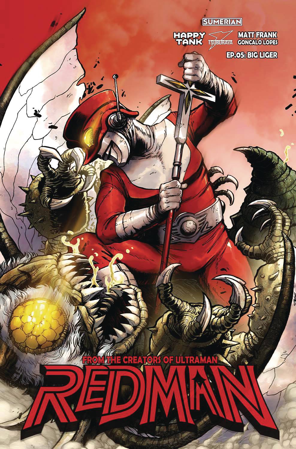 From the studio that created the beloved TV show Ultraman (now a Marvel Comics series and Netflix Show), here is Redman, the Kaiju Hunter! The star monster of this fifth episode is Big Liger (First Appearance). A new Tsuburaya's kaiju created by Matt Frank debuts in this comic book, the end of the first arc of Kaiju Hunter!