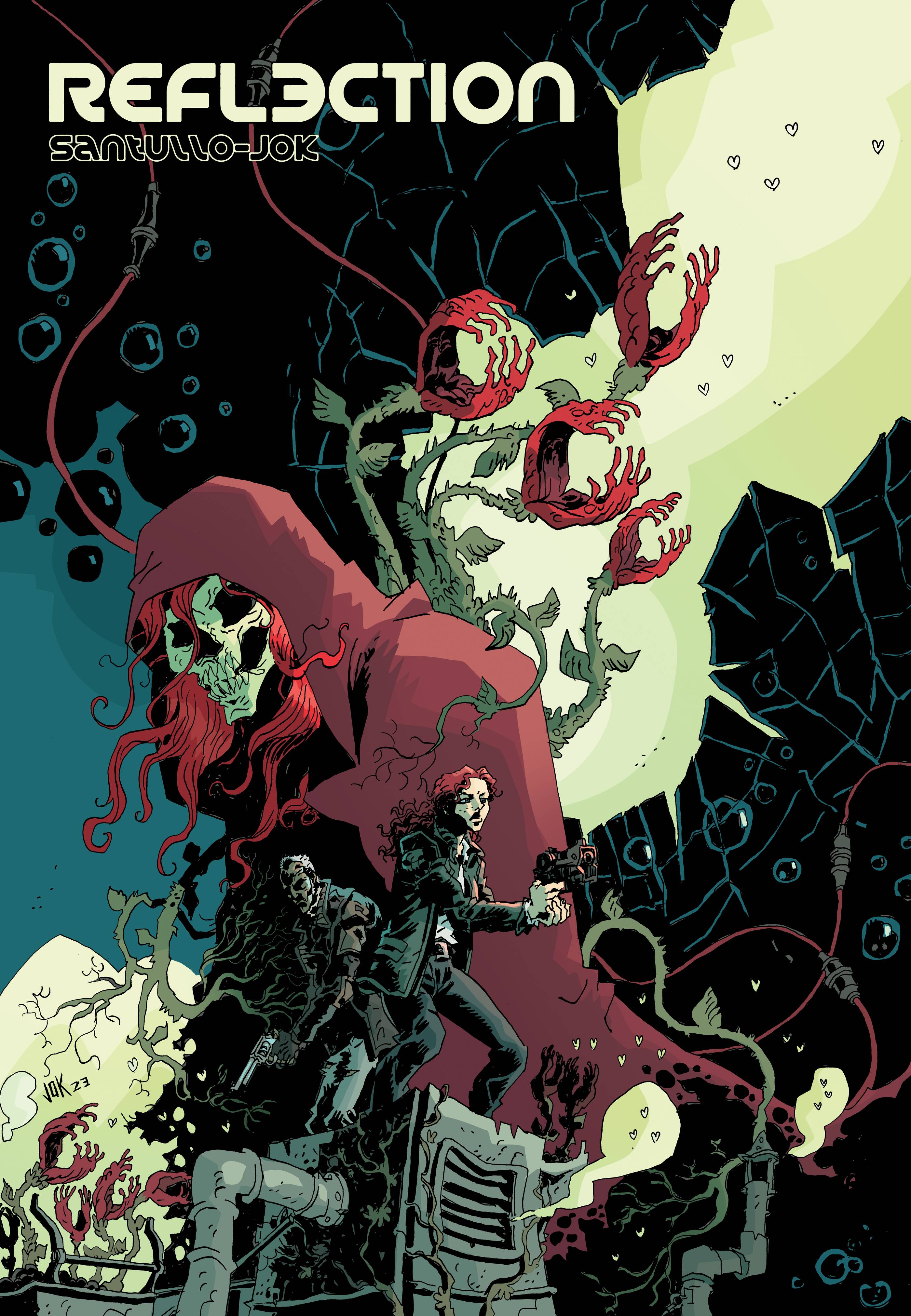 REFLECTION interior artist, JOK, delivers an epic homage to the style of Mike Mignola. Award-winning novelist and comic writer Rodolfo Santullo, best known for his work with Humanoids and Heavy Metal, joins forces with Argentinian superstar artist JOK (In Hell We Fight, Image Comics) for this giant-sized one shot of suspense and survival. In this near retro-wave future inspired by movies like Blade Runner or Looper with a unique horror twist to it. Detective Lorena Baffo dreams of a horrific murder. As the dream ends she looks up to see herself reflected in glass, with the victim's blood in her hands. Lorena gets assigned to this case and must unravel a mystery involving her own dark side and hidden family legacy.