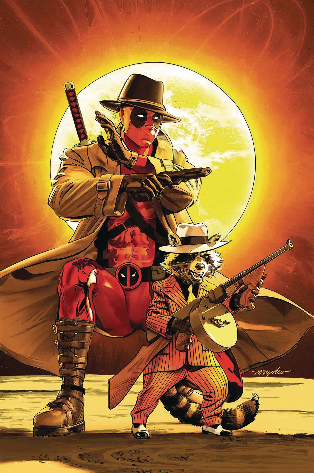 • On the lam and in the gutter, Rocket needs cash - lots of it, and yesterday. • That means tommy guns at dawn - as Rocket steals from an interplanetary mobster who makes the Kingpin look like Aunt May! • Guest-starring Deadpool, the sad clown of space! Nyah, buy it, see? Rated T+