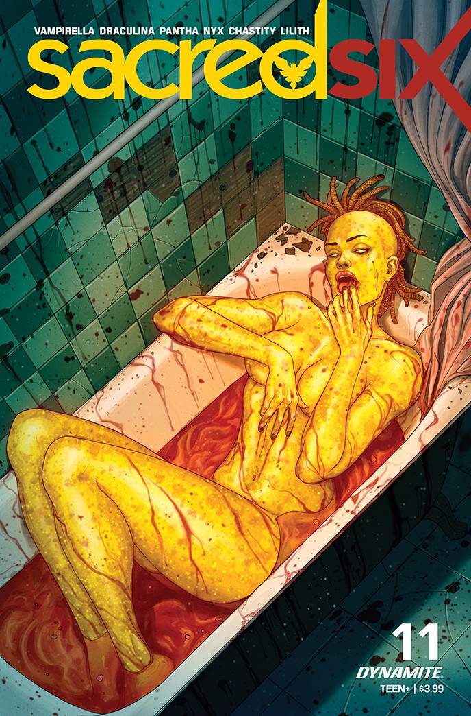 In our penultimate issue, our ladies who comprise the SIX find themselves hopelessly outgunned by the hordes of LEVITICUS, and to make matters worse, one of the SIX isn't on the same page as the rest! Could a guilty conscience take them all down?! Meanwhile, DRACULINA plots her revenge on her hated sister and the origin of NYX comes to its four-degree burn!