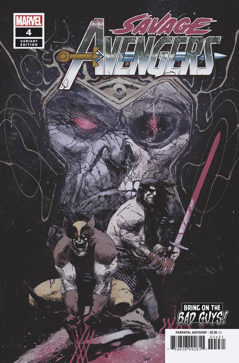 • The one evil wizard to rule them all, Kulan Gath has succeeded in summoning an ancient evil...and he's already hard at work on his next terrible plan. • Conan swings his savage symbiotic sword against the forces of darkness... • ...and Frank Castle has the worst day of his life. (If you don't count that day in the park.) • The Savage Avengers are fighting to save YOU! Parental Advisory