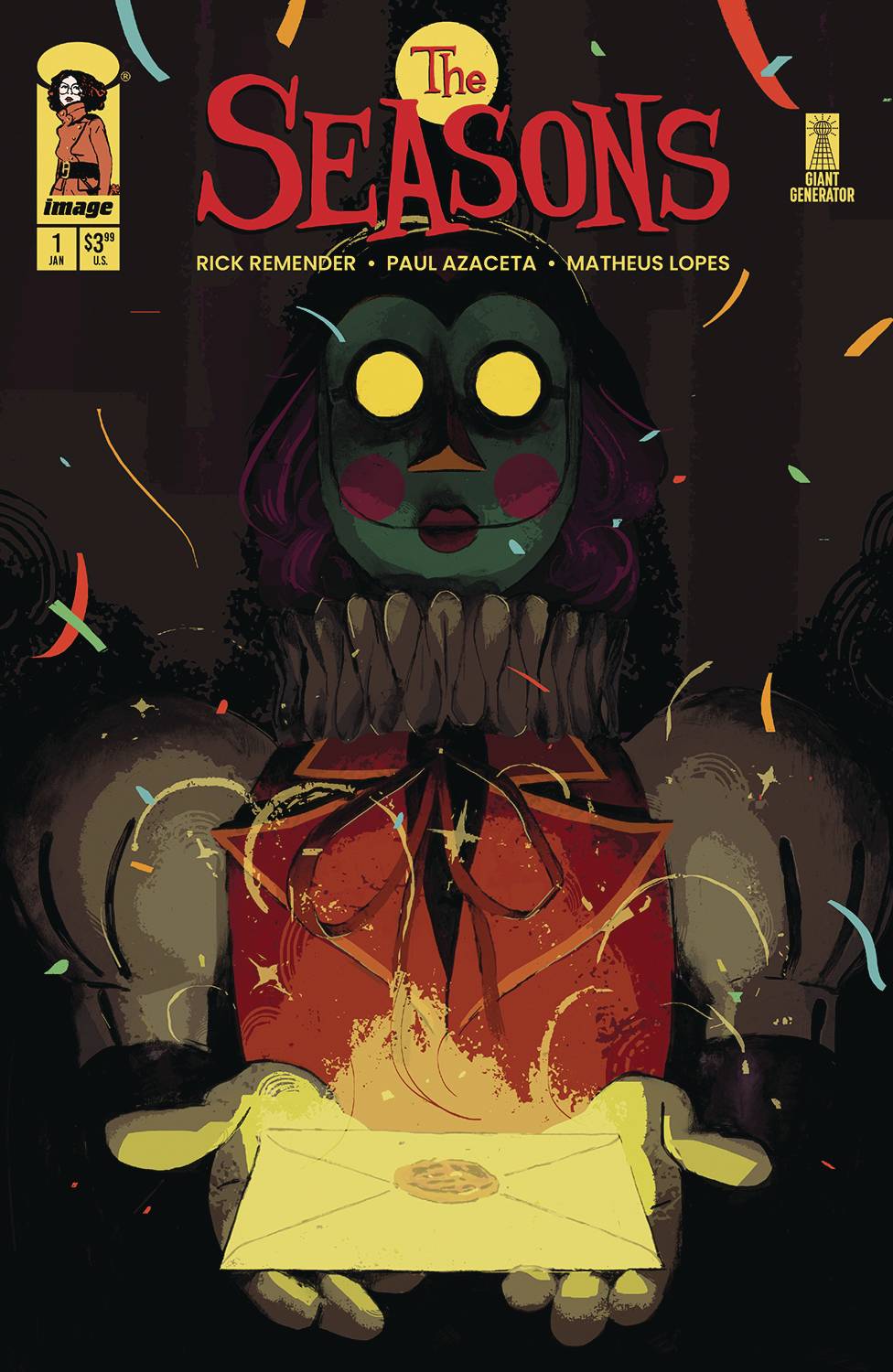 Series Premiere. Come one, come all, to the amazing new big top show! Your Ringleaders, Rick Remender and Paul Azaceta, invite you to this fantastical double-length premiere issue of their new ongoing series! A decade after the Seasons sisters' beloved parents disappeared, a wicked carnival arrives in town. Within its big tent is a dazzling show led by an eldritch ringleader who offers comers-all a window into their heart's every desire-provided they each leave a piece of themselves behind... Attendees arrive to enjoy the breathtaking entertainment obscured behind its canvas folds-and they leave distracted by the glint of these cursed mirrors. Now it's up to the often-overlooked youngest sister, Spring, to find her missing sisters and put a stop to the Faustian hold the carnival and its cursed mirrors have on its guests. But will she be able to piece her shattered family back together before it's too late for them all?