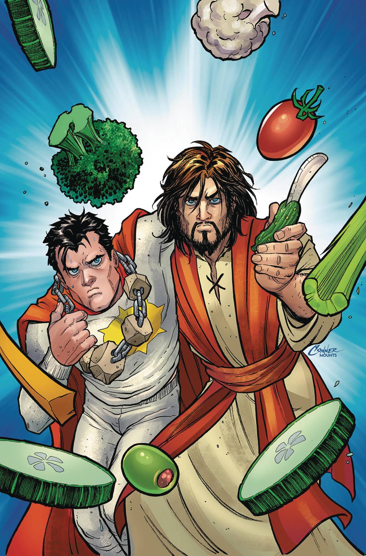 Extra-sized first season finale, featuring 30 pages of story! Sunstar and Shiela leave Jesus in charge as they go off on their honeymoon. Satan tempts Jesus one last time. Plus! Illustrated prose fiction, humor, and/or poems, and an exclusive preview of writer/creator Mark Russell's brand new Ahoy title, debuting soon!