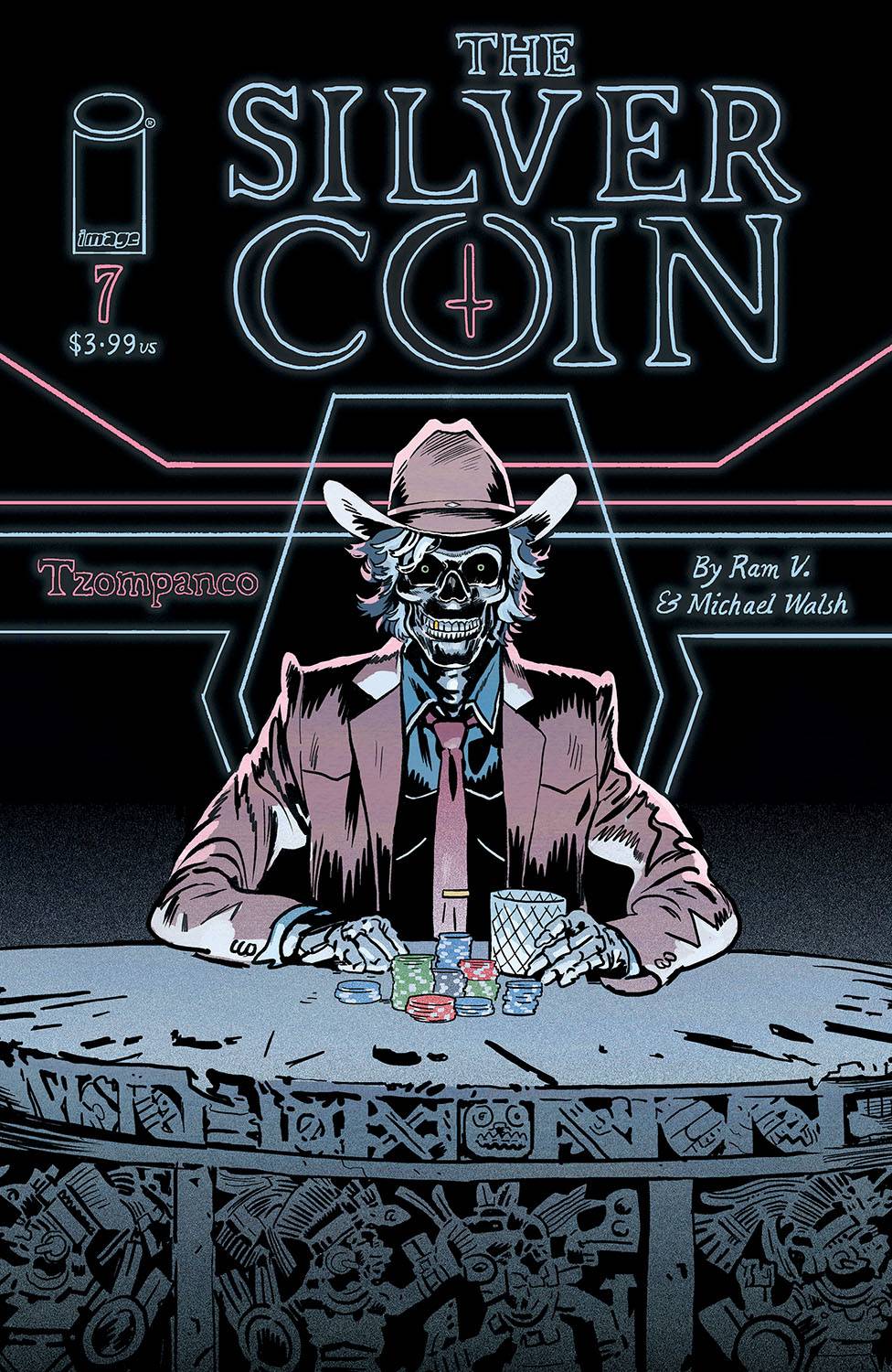 From creator MICHAEL WALSH and RAM V (Swamp Thing, BLUE IN GREEN) hit horror anthology THE SILVER COIN heads to the land of jackpots and washouts. For the first time in his life, Lou Prado is on a winning streak. Maybe it's the new casino or maybe it's the lucky coin in his pocket, but all of a sudden, Loser Lou's bets can't go wrong. He's about to make the gamble of his life-and the stakes are deadly high atop the Tzompanco.