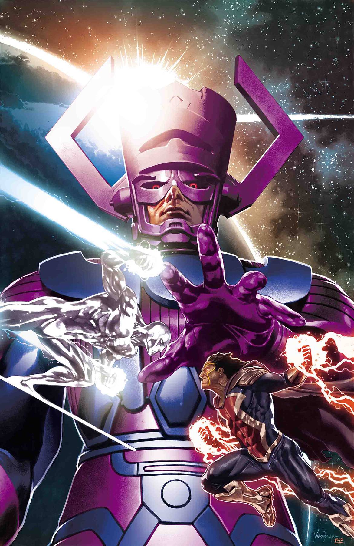 Continuing Prodigal's journey home from FANTASTIC FOUR: THE PRODIGAL SUN #1, the one individual who can aid him in accomplishing it is the Silver Surfer. But Prodigal has a history with the Surfer. Witness that now as we see the Surfer, back when he was still the herald to Galactus, as Prodigal battles him to prevent Galactus from destroying an entire world because of his unending appetite. Rated T+