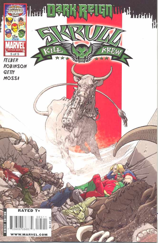 Written by ADAM FELBER Penciled by MARK ROBINSON Cover by MARIO ALBERTI Cow Variant by TOP COW It's just a bloody mess as the ridiculously over-the-top Krew of Skrull Killers finally confronts an enemy that may be too much for them to handle. The cover has a cow with a gun mouth...and that's nowhere NEAR the weirdest thing in the issue. 32 PGS./Rated T+ ...$3.99