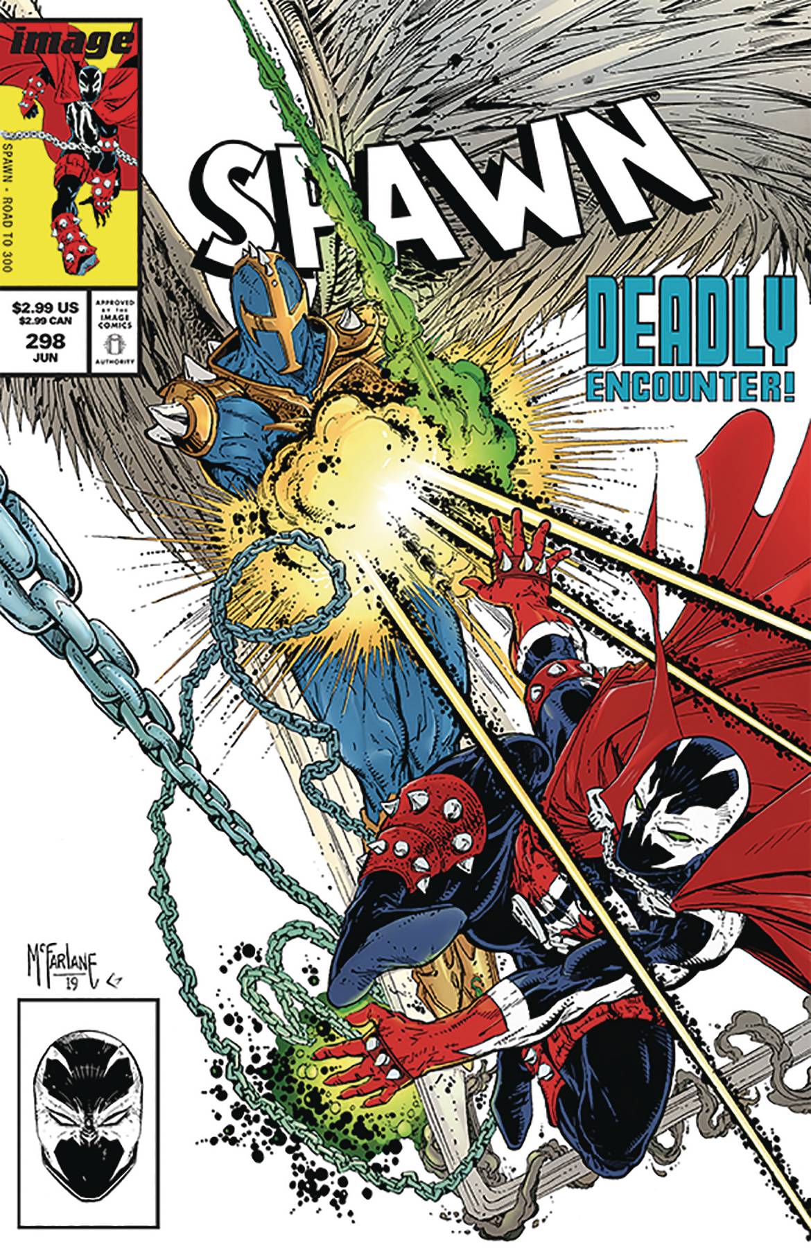 "WAR TO 300," Part One-TWO ISSUES 'TIL SPAWN #300! Spawn vs. the full might of Heaven's newest Godsend-ROUND 1! TODD McFARLANE and JASON SHAWN ALEXANDER up the ante in this lead-up to SPAWN's record-setting 300th issue, featuring TODD McFARLANE's special parody recreation of one of his own classic comic book covers!