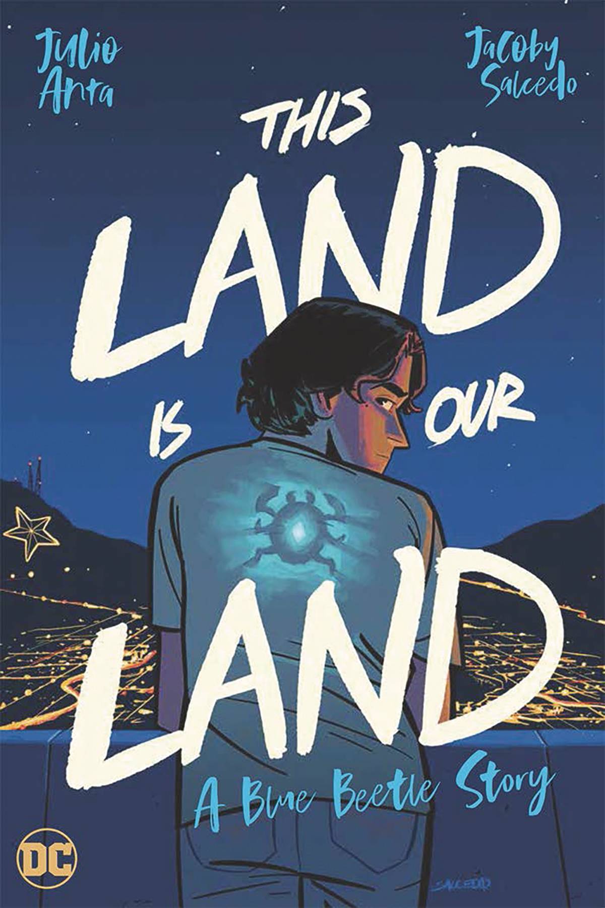 Writer Julio Anta and artist Jacoby Salcedo, the dynamic team behind the young adult graphic novel Frontera, take readers on a gripping and inspiring journey filled with high stakes and heart as Jaime embraces his new calling as Blue Beetle! Jaime Reyes is an ordinary high school student in El Paso, Texas, with a deep love for his family, culture, and home, and loves nothing more than his neighborhood's spontaneous gatherings that go late into the night. But lately, he's begun to realize that he and his border community are being used as pawns in an increasingly toxic immigration debate. The last few months have seen armed troops deployed along the U.S. and Mexico border, manufactured crackdowns at official border crossings, and a mounting resentment among a group of disaffected and reactionary youth. Jaime's problems get even more complicated when he finds an odd bug-like artifact while stargazing. He starts feeling a little different--like there's another voice in his head pushing him toward his most base instincts. And to make matters worse, he's been having surreal dreams that show him that the true threat El Paso faces isn't illegal aliens but actual aliens known as the Reach. In fact, according to his dreams, Jaime is meant to pave the way for the Reach's impending invasion!