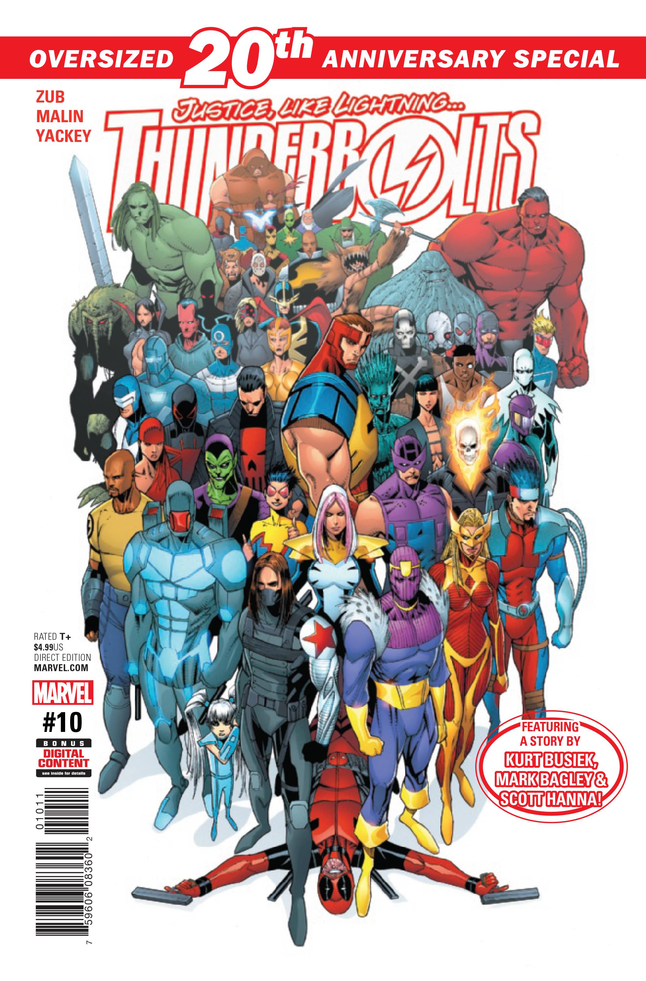 20TH ANNIVERSARY ISSUE! • Once upon a time the Thunderbolts were the Masters of Evil...and if Baron Zemo has his way, their legacy will be reclaimed...with the infinite power of a Cosmic Cube! • Captain America's sinister plan for Bucky and Kobik begins to unfold. • "Return of the Masters," the Thunderbolts 20th anniversary event, begins here! Along with our pulse-pounding lead story, this special oversized issue includes a brand-new Thunderbolts tale by series co-creators Kurt Busiek and Mark Bagley! Rated T+