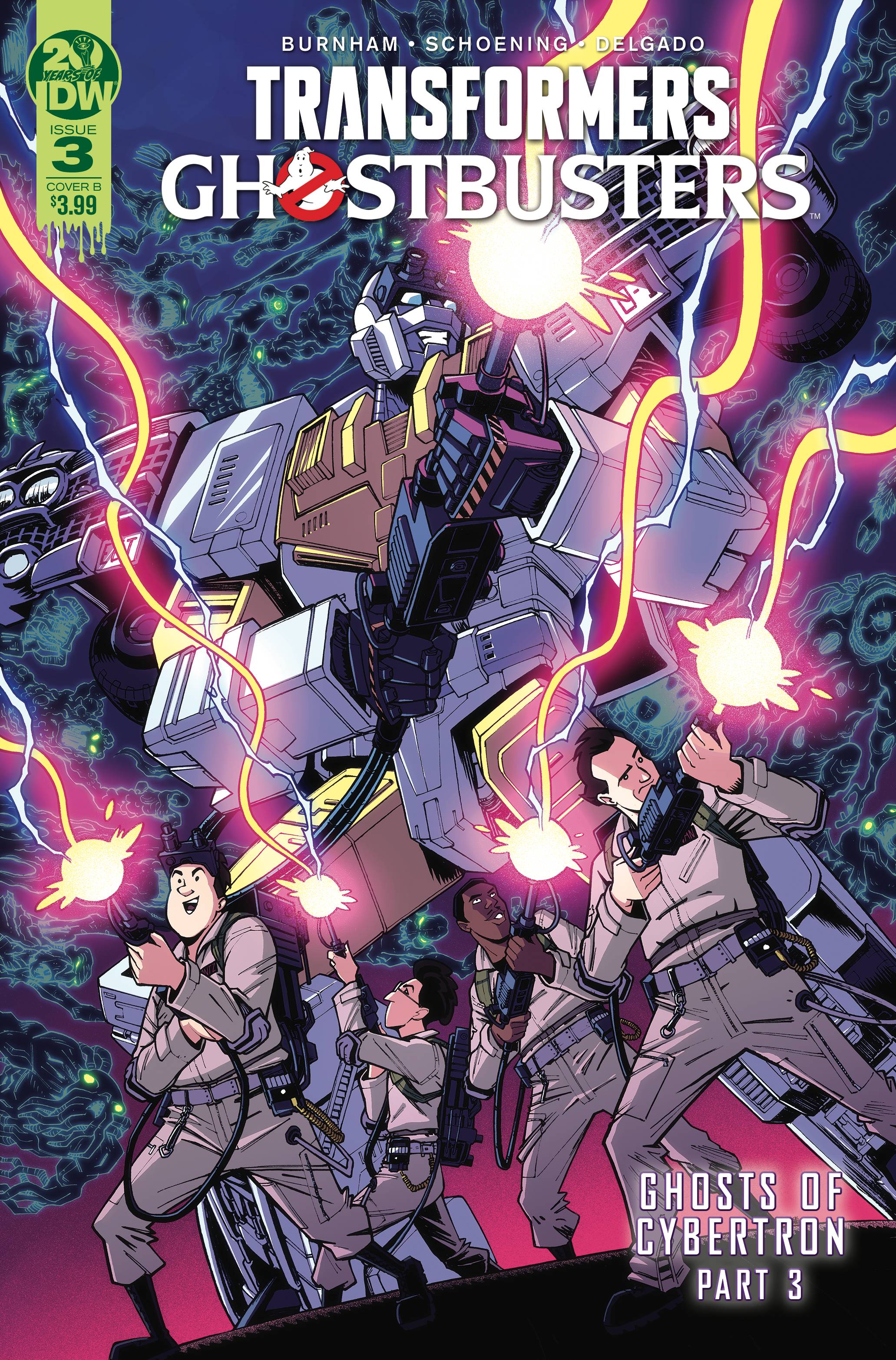 "GHOSTS OF CYBERTRON", PART 3! The 35th anniversary meeting between Transformers and Ghostbusters continues! Ectotron came to Earth and found a situation far more complicated than he was expecting, which means Optimus Prime is going to need to be brought into the picture. But until Optimus can arrive, Ectotron takes the opportunity to join the Ghostbusters on a case and observe the paranormal. And don't forget about the ghost of Starscream! Prime gets slimed! Featuring a brand-new Autobot-Ectotron-and other crossover surprises! Written and illustrated by the long-time fan-favorite Ghostbusters creative team of Erik Burnham, Dan Schoening, and Luis Antonio Delgado! Five action-packed interconnecting covers from series artist Dan Schoening! The series will also include covers from superstar artists like Nick Roche, Alex Milne, Paulina Ganucheau, Priscilla Tramontano, and more!