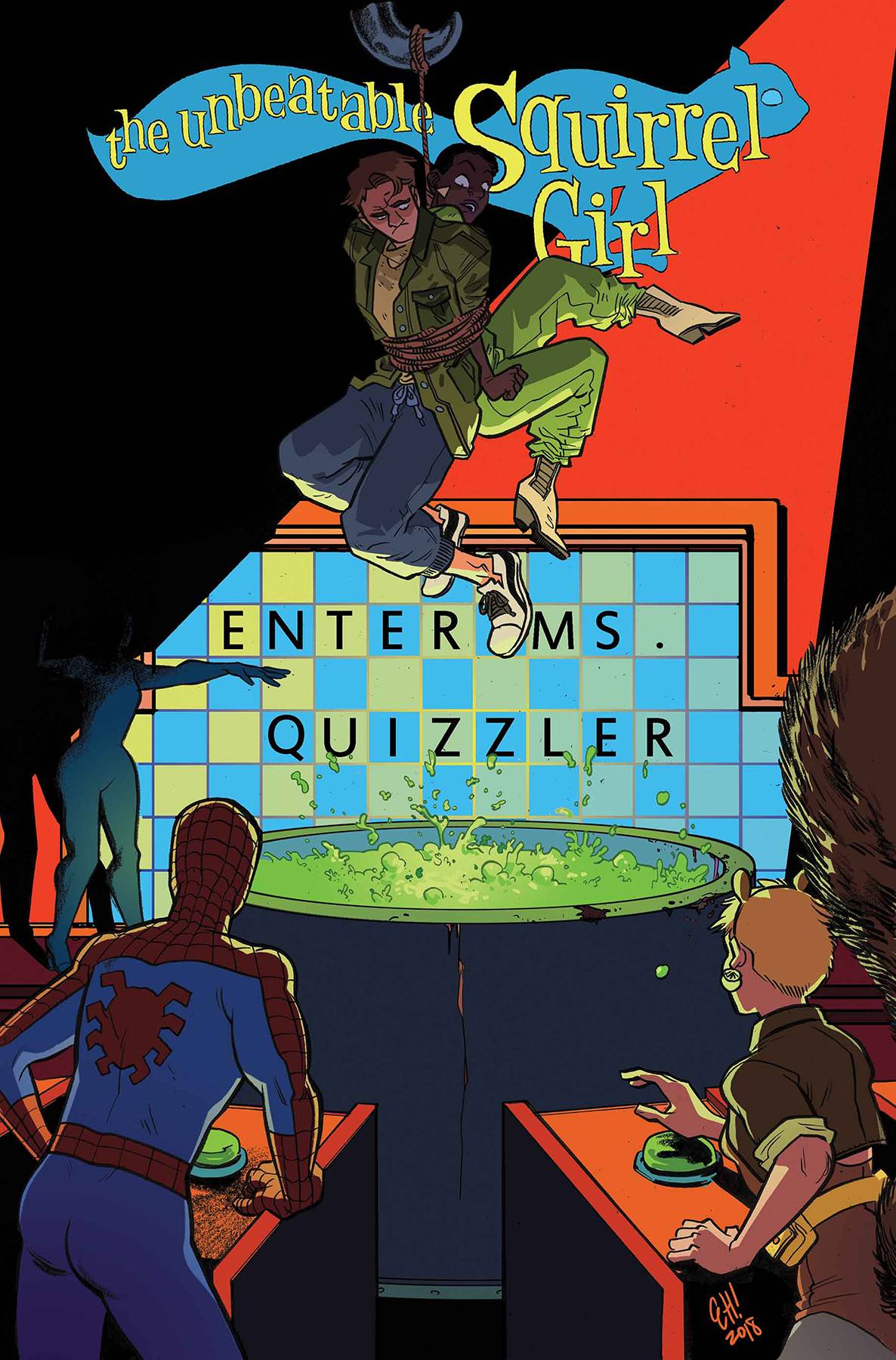 • In the past months, Squirrel Girl has battled Kraven, rescued NYC from supernatural silence, kinda-maybe died and also fought Skrulls! So now it's time for a nice break...which is why in THIS issue, Squirrel Girl does nothing but watch public domain movies on television! • That's right! She just sits there! You can kinda see the TV screen over her shoulder in a couple of panels, but that's it! It's really quiet and relaxing and nothing much happens. • ... • ...THAT IS, UNTIL NANCY WHITEHEAD AND ANOTHER ESU STUDENT BY THE NAME OF PETER PARKER ARE TAKEN HOSTAGE BY A SUPER VILLAIN INTENT ON PROVING THAT SHE'S THE SMARTEST PERSON ON THE PLANET! • Then it's super hero battles featuring THOR and SHE-HULK on a DATE! SQUIRREL GIRL matching wits against MS. QUIZZLER! And MORE! • Artist Naomi Franquiz makes her MARVEL DEBUT in a stanalone adventure you won't want to miss! Rated T