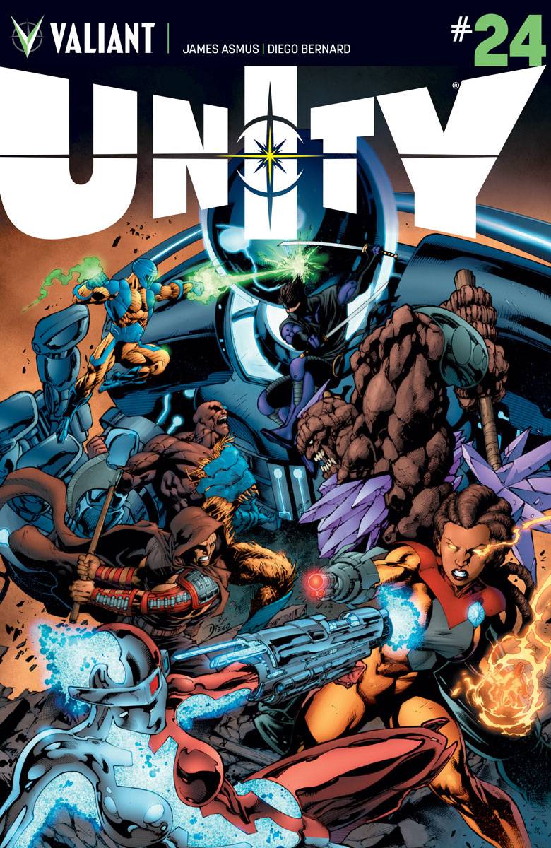 Unity vs. the Armor Hunters...rematch! GIN-GR, the reformed killer robot who destroyed Mexico City and rampaged through downtown Los Angeles during the Armor Hunters' attack, has turned on her Unity teammates! As she perpetrates the world's most unstoppable jailbreak - a head-first, guns-blazing, kamikaze flight straight into the military base that holds her one-time squad - can X-O Manowar, Livewire, Ninjak, and the Eternal Warrior stop the giant engine of destruction...while trapped inside it? And if they survive GIN-GR, all they have to look forward to is the remaining Armor Hunters attacking from all sides! Multiple Harvey Award nominee James Asmus (QUANTUM AND WOODY) and rising superstar artist Diego Bernard (X-O MANOWAR) rocket UNITY into their most action-packed battle yet!