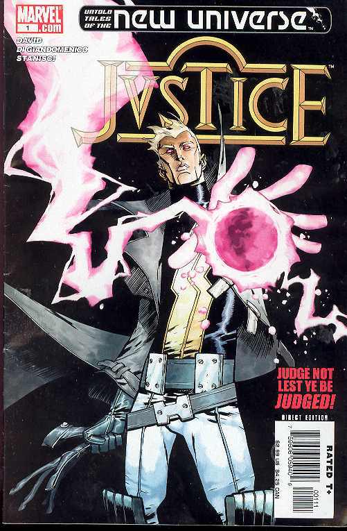 Written by PETER DAVID Penciled by CARMINE DI GIANDOMENICO Cover by ERIC CANETE Stalking the New Universe as judge, jury and executioner rolled into one, John Tensen--Justice--has made it his personal mission to make certain that paranormals are using their powers wisely. But when he executes an abusive paranormal in the presence of the para's daughter--potentially sending her down a path of evil--he is forced to question the "justice" of his own actions.