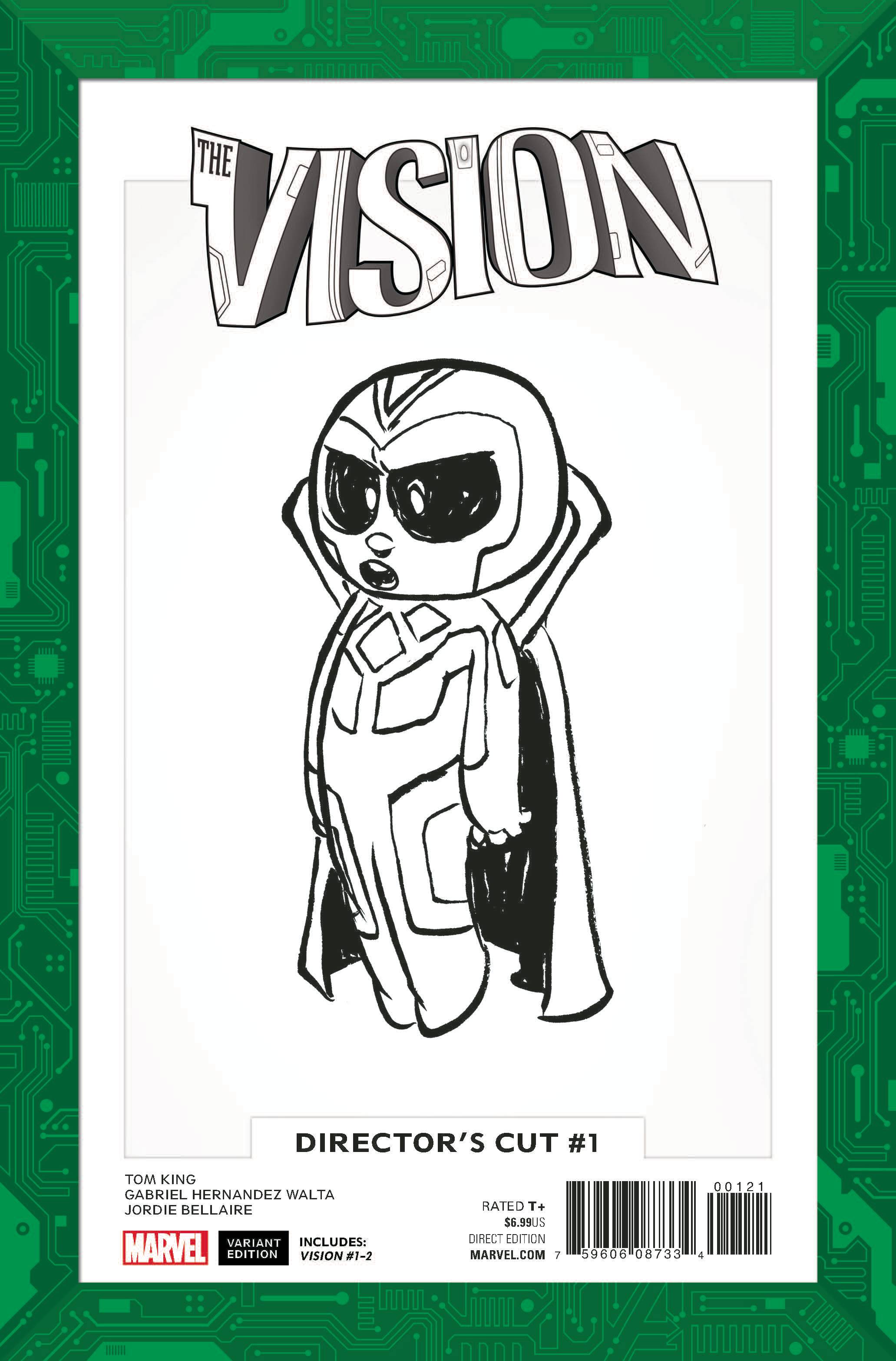 One of the most surprising super-hero stories ever told, now better than ever! Experience Tom King and Gabriel Hernandez Walta's masterpiece...re-presented with bonus behind-the-scenes content! Behold the Visions! They're the family next door, and they have the power to kill us all. What could possibly go wrong? Collecting VISION (2015) #1-2, plus extras - including Tom King's original series pitch, script excerpts, character designs and sketches by Gabriel Hernandez Walta, cover sketches by Mike del Mundo and more. Rated T+