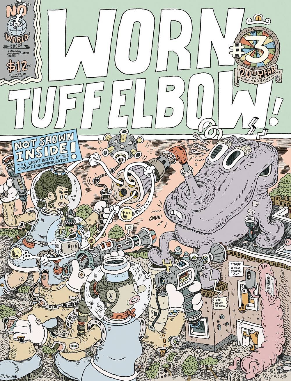 Follow the journey of Slogan Schnauzer as he is set the task of locating the Orgate Discombobulator. Sidetracked by a group of "foodies" (that resemble cue balls on two legs) and a variety of other personalities, Slogan becomes confused and lost and eventually on a plane to Japan (and subsequently stripped of his current identity by the powers that be). Resembling a fever dream, this full color comic strip is accompanied by fake satirical ads and other odds and ends that will be sure to delight the reader including Bell's foray back into satirical autobiographical comics. The exciting and dynamic third issue of Worn Tuff Elbow marks the 20th anniversary of this exciting series!