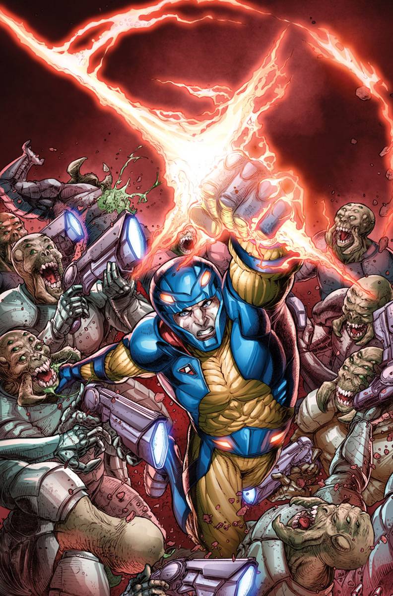 Long live the king! The march to X-O MANOWAR #50 soldiers onward! Witness the last stand of Earth's greatest champion, X-O Manowar! With the world besieged by the Torment, Aric of Dacia has united his bravest allies and fiercest enemies for a last ditch effort to avert armageddon. But will even their combined strength be enough against the seemingly infinite powers of this unfathomable cosmic race? Plus: The X-O MANOWAR #50 COUNTDOWN GIVEAWAY continues right here! Each issue of "LONG LIVE THE KING" comes bagged with one of 50 micro-prints - featuring artwork from a who's who of comic superstars - or even one-of-a-kind original art!