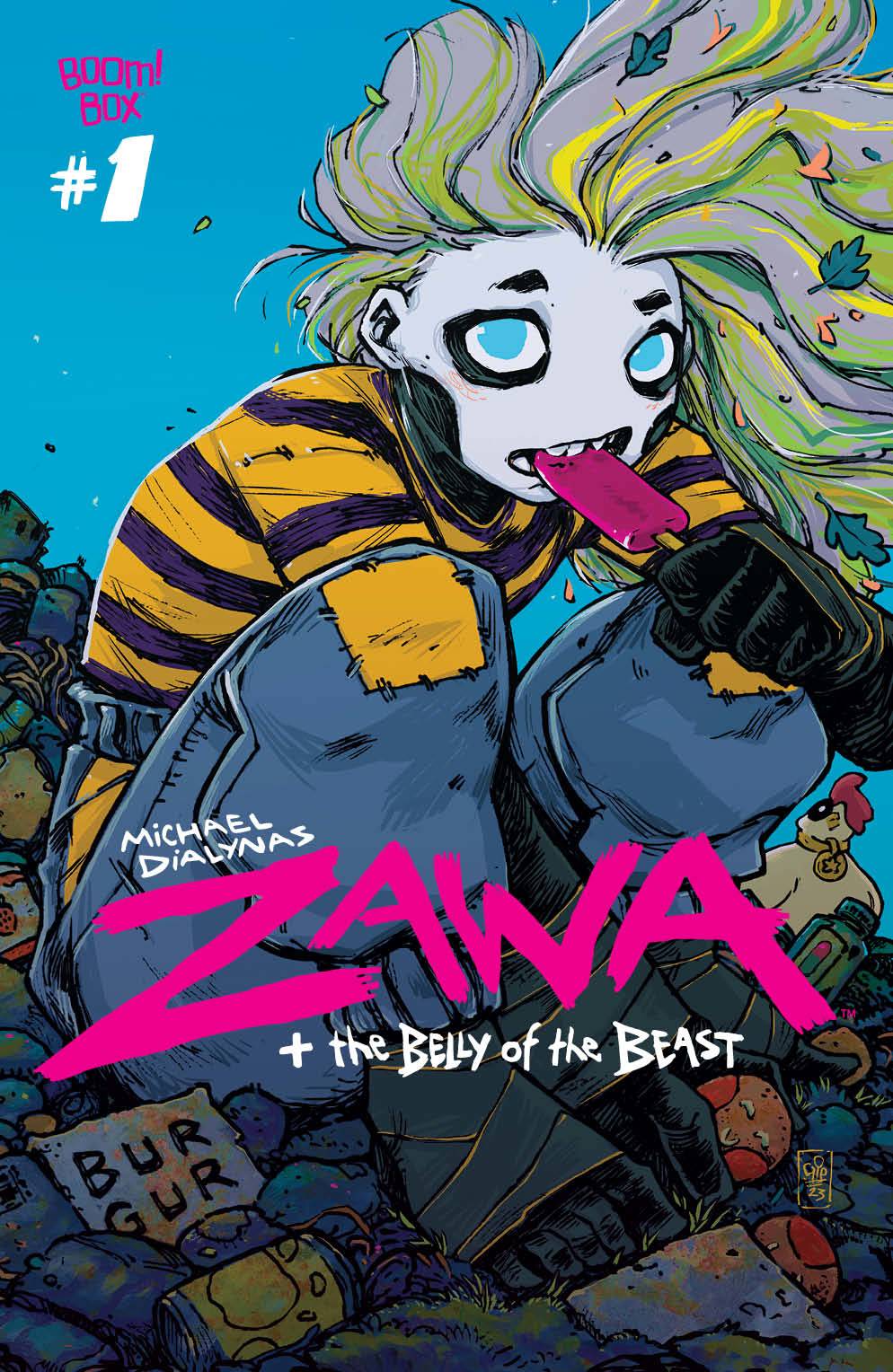 Trapped inside her mountain by pollution-spewing factories, the guardian spirit Zawa only has industrial waste to eat, leading her to a bitter existence of paranoia and destruction. But when two siblings from a nearby village help her escape, they'll quickly learn that the way to calming Zawa's heart is through a well nourished stomach! GLAAD Award-winning and Eisner Award-nominated cartoonist Michael Dialynas (Wynd, Teenage Mutant Ninja Turtles) crafts a charmingly macabre eco-fable about nature, greed, the dangers of retribution, and good food shared among friends.